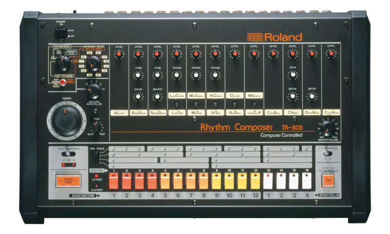 1曲分のリズムを自由に作成できる画期的なリズムマシンとして、1980年に発売された「TR-808」。当時のミュージシャンやプロデューサーの音楽制作に大きな影響を与えました。歯切れのよいスネア、重低音のバス・ドラム、特徴的なカウベルやハンド・クラップなど、その独特なサウンドは、発売から40年以上経ったいまもなお、世界中で根強い支持を集めています。