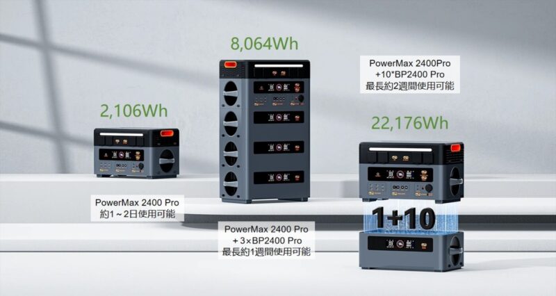 拡張性:2,016Wh〜22,176Wh(PowerMax 2400 Pro+最大10*BP2400 Pro)