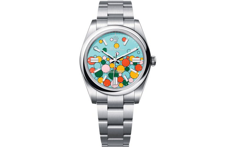 ロレックスの3大発明のうち防水性能を表す“オイスター”、全方向回転の自動巻き機構“パーペチュアル”の2つを要する名作。耐蝕性の高い904Lスチールケースに、セレブレーションモチーフと呼ばれるポップな新ダイアルが華を添えている。ケース径41mm、自動巻き、100m防水。