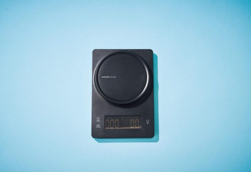 タイマーの自動開始・停止機能付きのデジタルスケール。正確な豆量と湯量、抽出時間を計測し、好みを探求しよう。