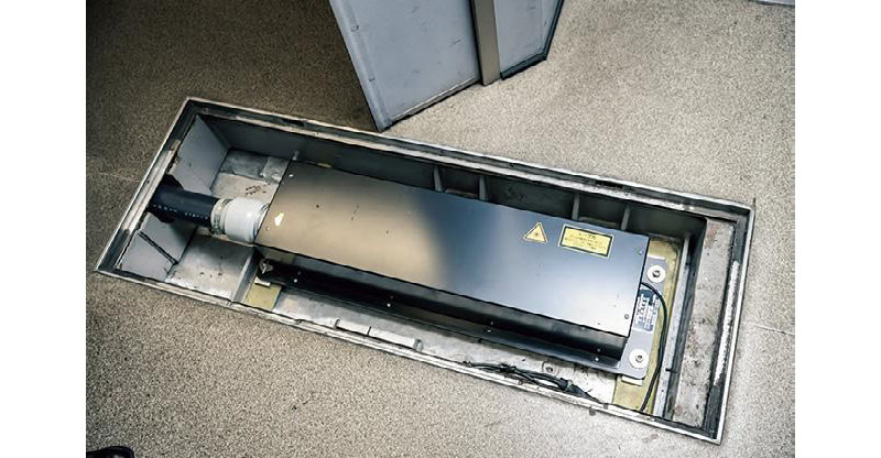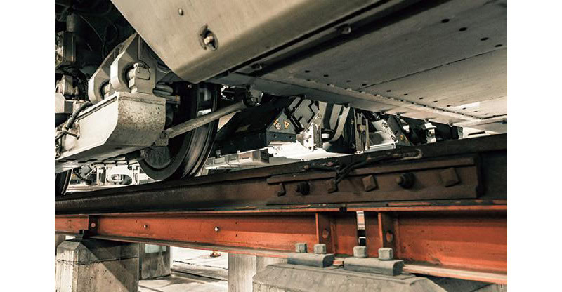 車両下にある大きな台車の奥にレーザー光を照射する機械の姿が見える。