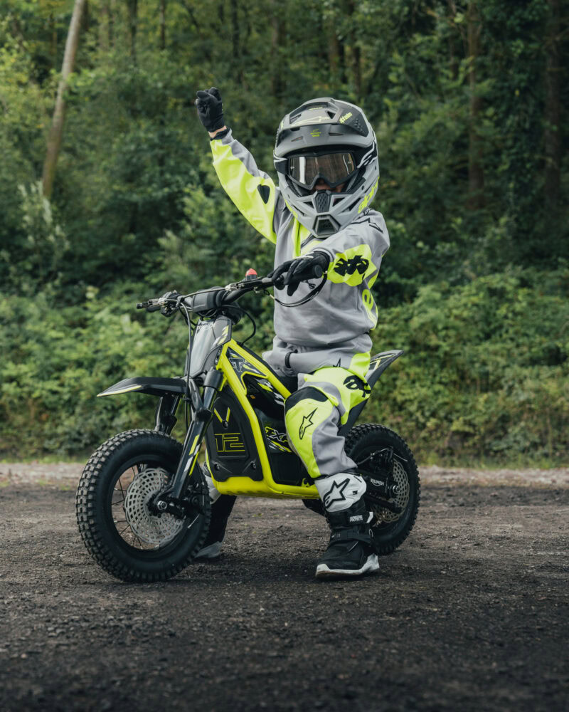 安全で自信を育むモーターサイクル入門体験を提供するTXP-12は、3~5歳向けの設計。小さなライダーでも両足をしっかりと地面に着けることができるシート高で、軽量スチールフレームを採用することで持ち上げやすく、操作やコントロールも容易となっています。フロントには50mmフォーク、リアにはリバウンドおよびプリロード調整可能な60mmコイルショックを装備し、成長に合わせて調整可能。