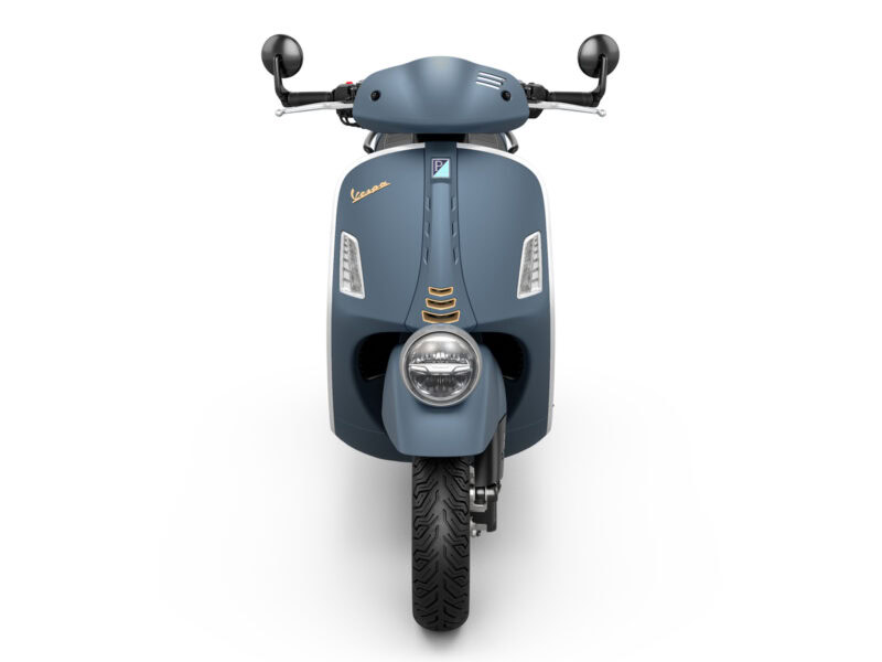 フロントフェンダー上に低くマウントされたヘッドライトやむき出しのパイプハンドルが特徴的な「Vespa GTV 300」