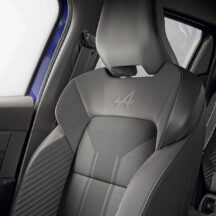 フロントフェンダーにはアルピーヌのエンブレム、アルミペダルやステアリングヒーター付TEPレザーステアリングのほかシートバックにもロゴがあしらわれ、アルピーヌの世界観を表現しているのです。